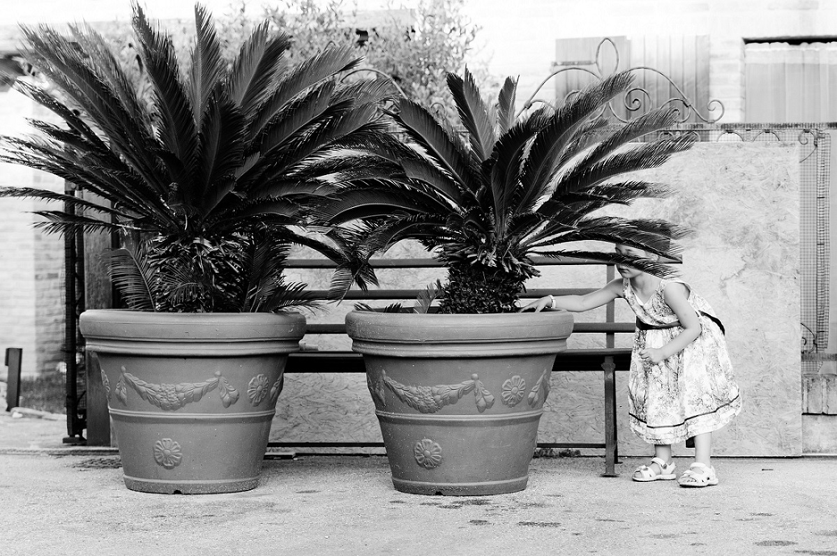 Ciao, a mio avviso il bel visino che e' impallato dal ramo inficia negativamente la resa di questa proposta. I vasi gemelli cosi' grandi poi rubano l'attenzione, relegando la piccola non a soggetto bensi' a contorno.