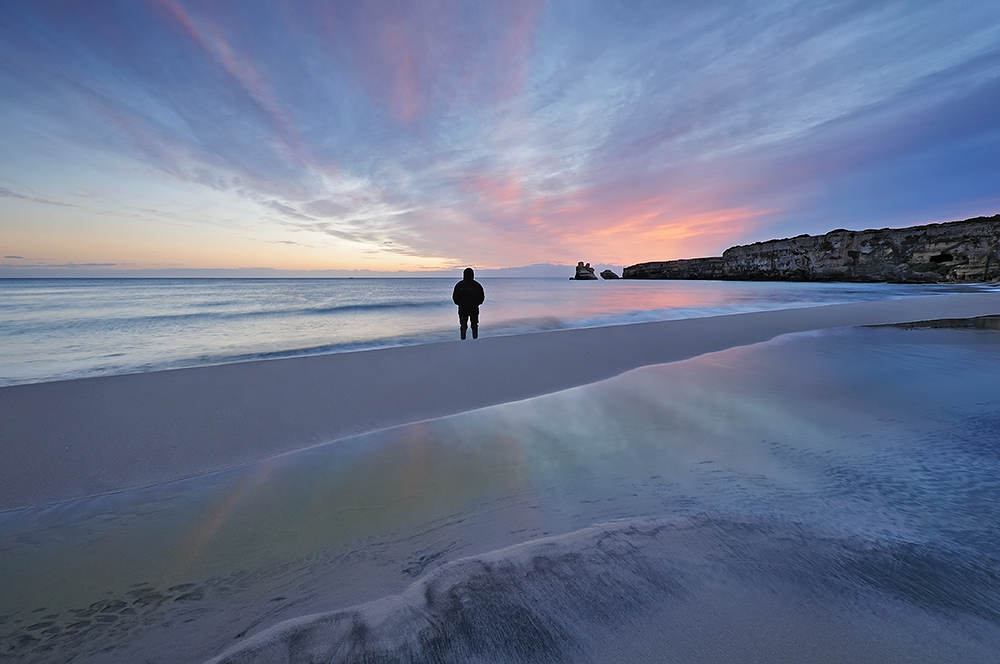 La foto trasmette una sensazione di solitudine di fronte agli elementi naturali. Buona inqudrature con belle cromie