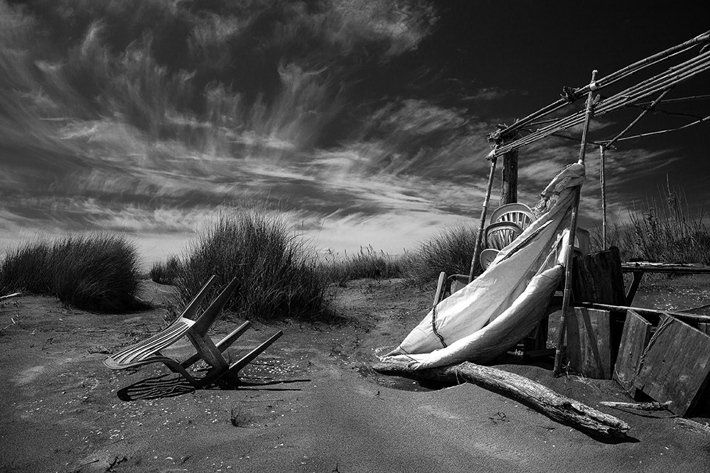 Una foto davvero speciale Franco. Il paesaggio si fa scenario, per questi relitti di vita terrestre, ai bordi di una marina di cui si intuisce solo il respiro e la luce intensa. Un cielo che si fa, nella conversione crepuscolare, per accogliere al meglio queste garze leggerissime di nuvole, che si fanno ballerine nell'azzurro, ( un colore che si vede anche se tu hai scelto di non mostrarlo. ) L'ombra di quella sedia bianca sulla sabbia spessa è un piccolo spettacolo nello spettacolo: netta e silenziosa. So che il bianco e nero è il tuo campo prediletto, ma qui lo usi per dare anima e ragione a queste mobilie abbandonate, a questi tessuti stracciati dal tempo, che raccontano muti tante storie di mare. Davvero una ottima prova. Preferite