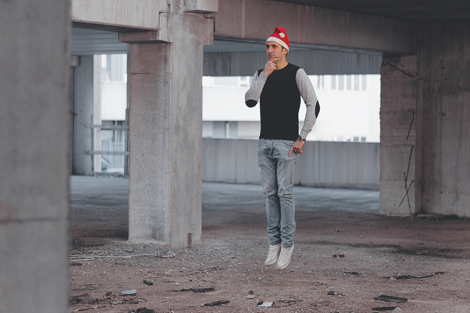 Gustosa e surreale, sia per la location che per l'insolita figura sospesa e il suo curioso atteggiamento.