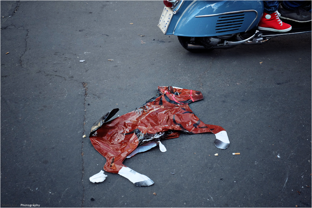 Molto bella e accattivante dal punto di vista cromatico. Si riesce a intuire i due ragazzi sulla vespa fermi ad osservare il povero cavallo sgonfio, piatto e disteso sull'asfalto...Complimenti Mario