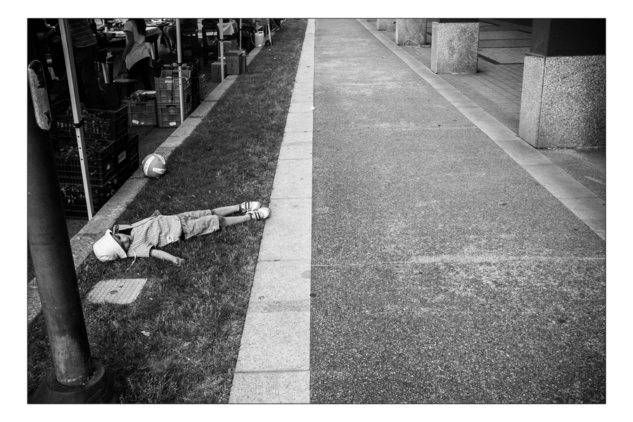 Il bambino stava giocando da solo con un pallone. Mi sono avvicinato e ho fatto qualche scatto, poi quando gli ho fatto un cenno di saluto perchè mi stavo allontanando si è sdraiato sull'erba. La scena è stata immediatamente interrotta dalle urla della madre del bambino.