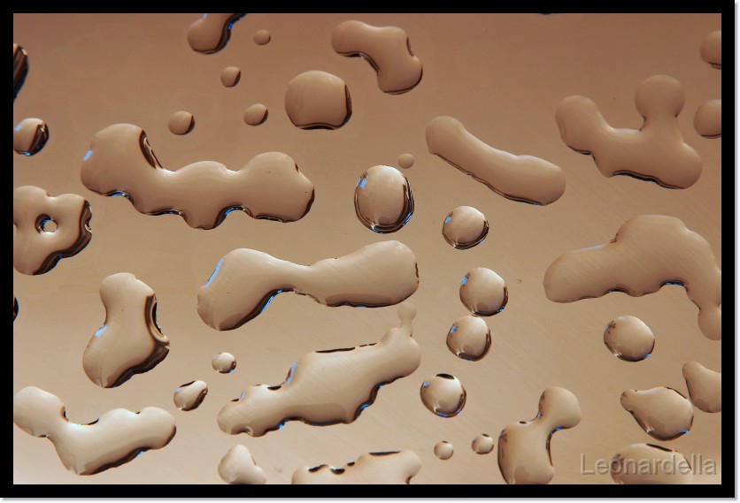 Gocce d'acqua su una lastra di acciaio. Luce del tramonto e riflesso del cielo azzurro. _________________ __________________________