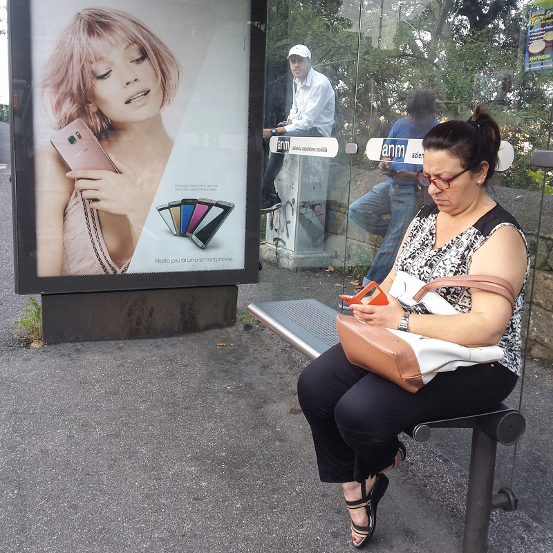 Graziosa. La ragazza al cellulare che non può fare a meno di sbirciare quello altrui, con tanto di spettatore dietro le quinte