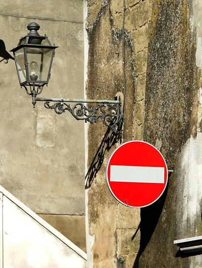 Sul mio monitor il rosso spara il giusto, non dimentichiamo che è direttamente illuminato dalla luce naturale. E' anche il soggetto principale della foto, insieme al lampione. Ecco forse il centro di interesse della foto è proprio il contrasto tra l'antico, il lampione, e il moderno, il segnale di divieto. Quell'ombra nera in alto a sinistra andrebbe "tappezzata" via con photoshop..