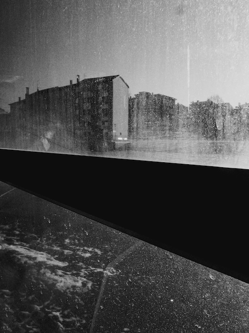 Atmosfera graffiata, vaga, sospesa, eppure con un serie di linee guida nel riquadro dure e taglienti. Ma il soggetto paesaggistico si dilata, si diluisce quasi in una forma disegnata e sottilmente onirica si fa ricordo. La parte inferiore sembra dura realtà, fredda geometria, mentre oltre la diagonale di nero del muretto sta un mondo lontano, nel tempo e nello spazio. Mi piace molto.