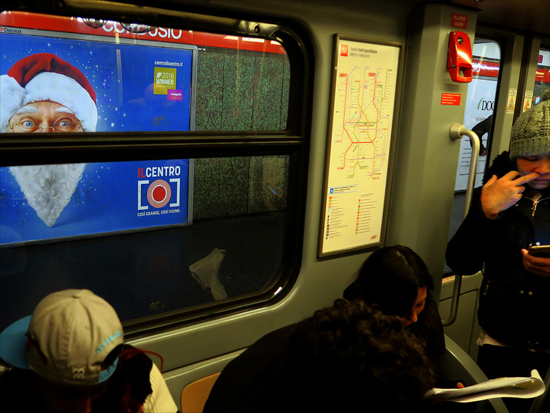 Oltre allo sguardo scrutatore del babbo natale dal finestino, mi ha spinto a scattare la presenza della scritta accoppiata al gesto della donna al margine destro.