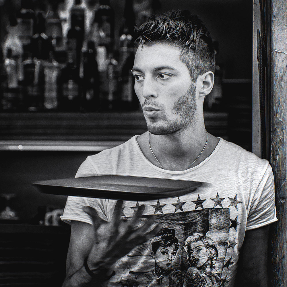 Grande resa del b/N su questo volto, luminoso e brillante, contro uno sfondo contestualizzante ma anche perfettamente soffice. Si legge una espressione scanzonata e sottilmente divertita.