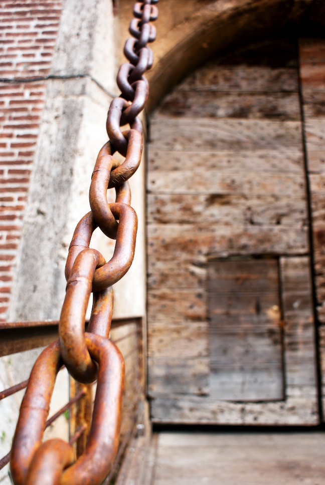 catena in primo piano a fuoco + porta serrata sullo sfondo leggermente sfocata e il messaggio di libertà arriva forte e chiaro.