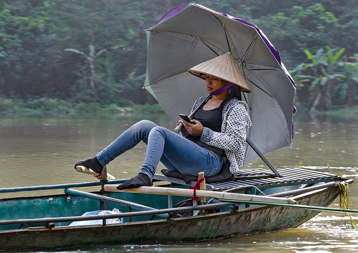 E' un'immagine scattata in un sito Vietnamita chiamato Halong Bay sulla Terra o Dry Halong Bay. La piccola barca (con al massimo tre passeggeri) è guidata principalmente da donne che, come da tradizione, remano con i piedi; si scivola dolcemente lungo il fiume Ngo Dong in un paesaggio da favola attraversando via via tre caverne scavate sotto monti di calcare. |