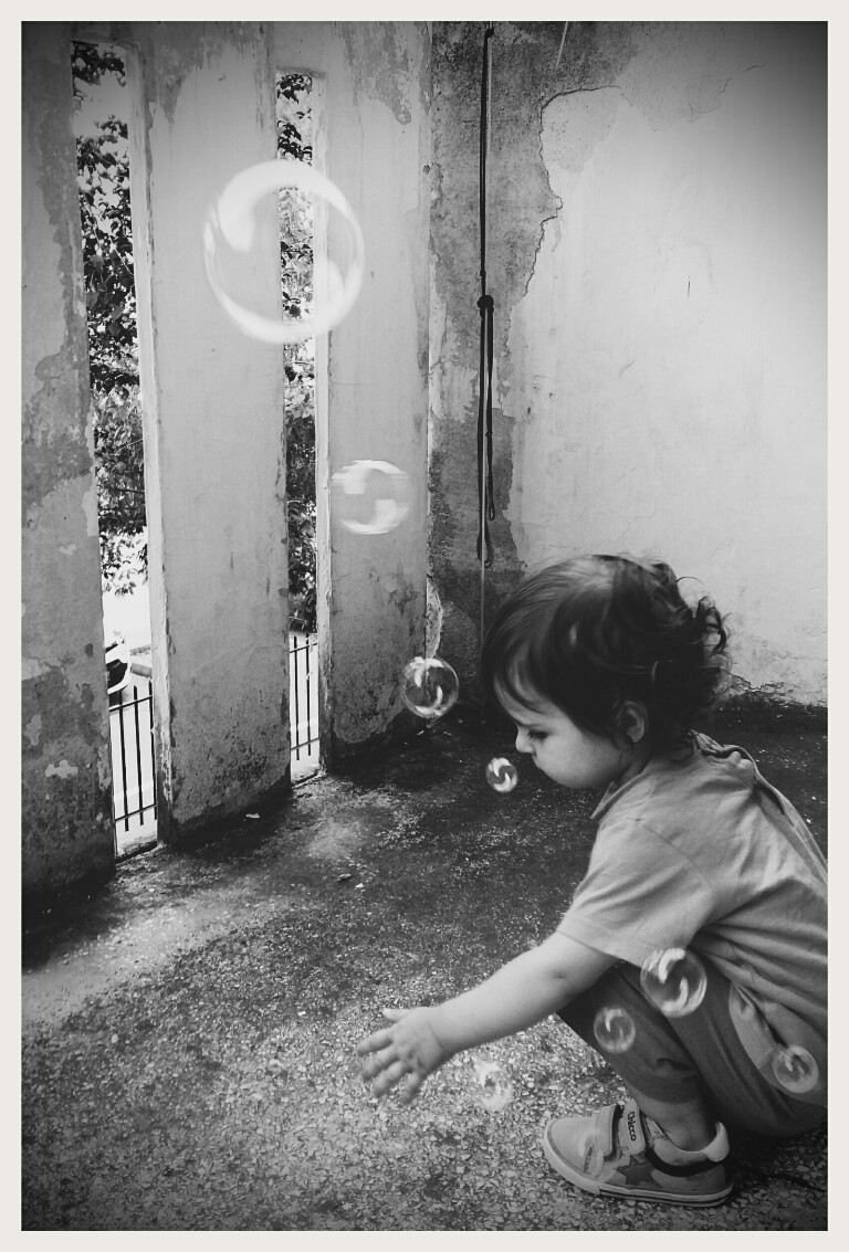 A volte andare contro le regole restituisce belle soddisfazioni, una ripresa dall'alto , un corpicino tagliato e la molta aria sopra che slancia la lettura . Il momento colto è davvero grazioso, a tratti triste vedere questa bimba giocare con le bolle in un ambiente degradato, eppure tutto si trasforma in dolcezza e seppur assistiamo ad una scelta monocromatica si intravede scorgere un colore fanciullesco, hai ottenuto un risultato a mio parere molto coinvolgente Ok! Ciao
