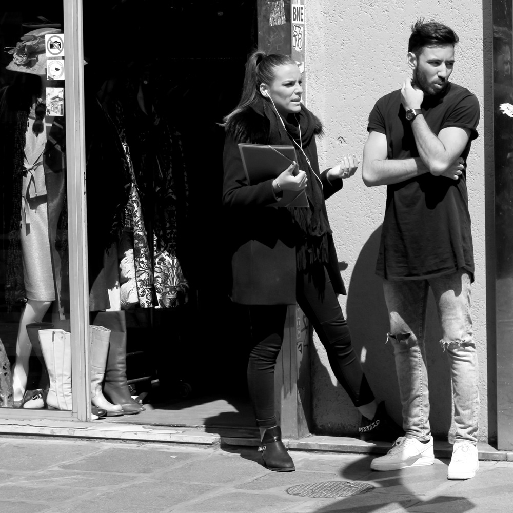 A me hanno colpito (determinandomi così allo scatto) la differenza di abbigliamento tra i due (lei sembra pronta per il Polo Nord, lui per l'estate, lei è precisetta - capelli-trucco-unghie perfetti - lui, come direbbe mio figlio, "sciallo" - con tanto di prese d'aria); la logorrea acuta di lei, del tutto in-differente all'in-sofferenza di lui per la situazione; il damasco colpito dal sole in vetrina indifferente alla bruttezza degli stivali vintage, che sembrano rubati al costumista di un film anni '70; infine il divieto di fotografare cui io sono rimasta del tutto indifferente.