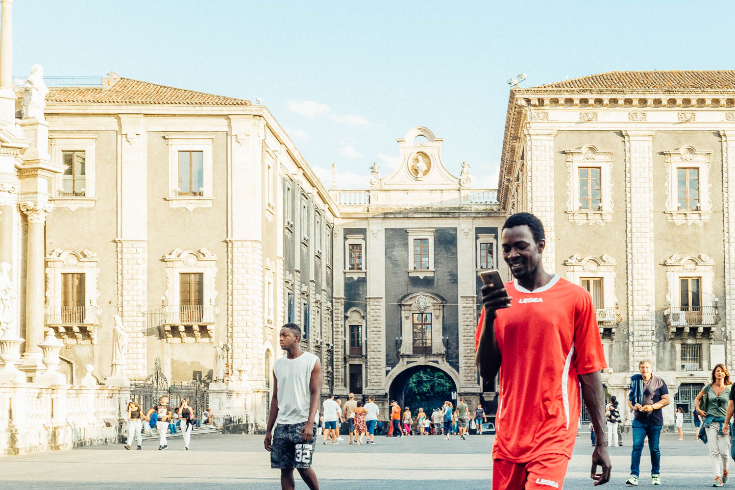 A me l'immagine piace anche nell'ottica "Street". Un uomo di colore sorride per qualche notizia ricevuta in quel preciso momento; un'altro piu' dietro al contrario sembra serio. E' un accostamento interessante, direi fugace e piuttosto difficile da vedere e riprendere.