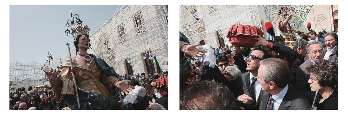 notevole il dialogo fra statue che sovrastano la folla. Il filo conduttore sono le mani lega le due immagini come fosse un tutt'uno . Lo sguardo al cielo della statua nella prima foto dialoga con lo sguardo dell'uomo con gli occhiali neri nell'altro fotogramma. La scena è vitale, concitata, accalcata, caotica ma ordinata dalla composizione, non freddamente rigorosa e dal pdr alto.