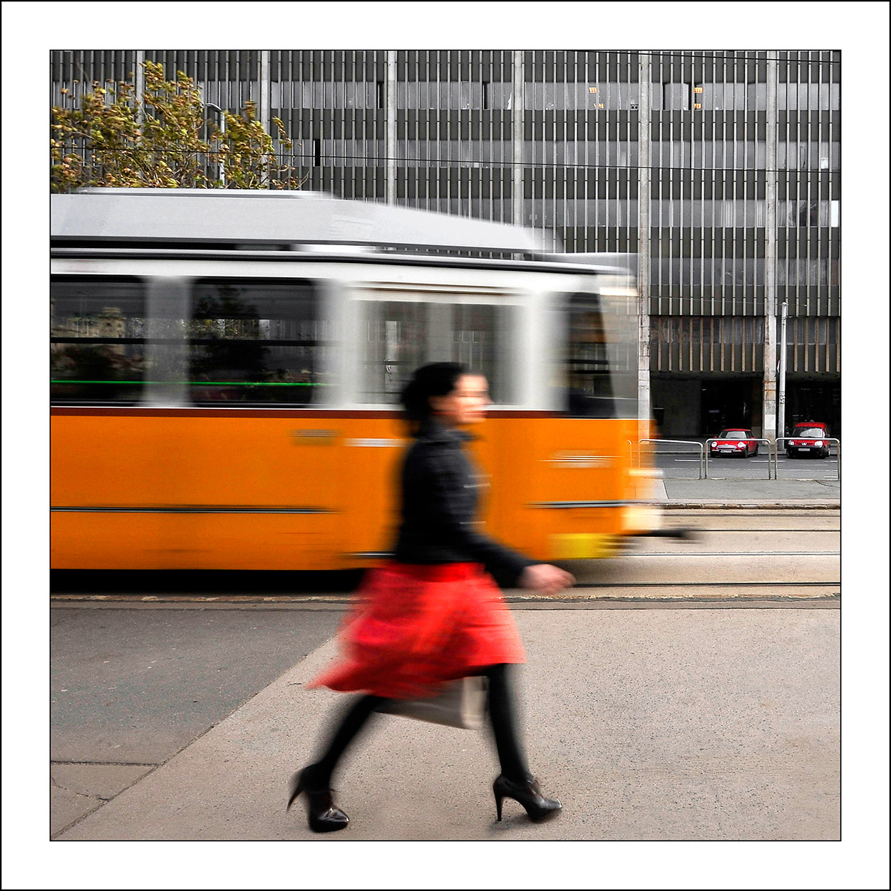 Le auto osservano con i loro occhioni, l'auto è femmina non solo come sostantivo anche se fu una intuizione di D'Annunzio, è seduttrice, ne ammiriamo le curve e ci piace possederla, chissà, forse quelle due rosse si immedesimano in quella bellezza irraggiungibile che tra poco il tram celerà alla loro vista.