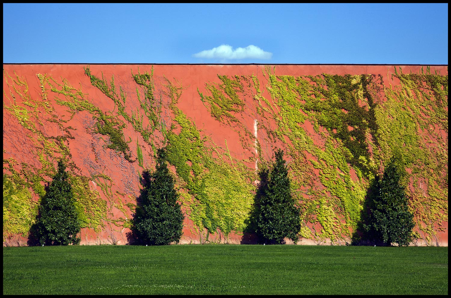 geometrie di linee rette e volumi severissimi al cospetto delle sinuosità della natura. Poi tre fasce: una semplice semplice (l'erba), una ibrida (ibridissima, muro-alberi-rampicanti, con cromatismi assurdi), la terza comunque ambivalente (cielo più un unica stagliatissima nuvola).
