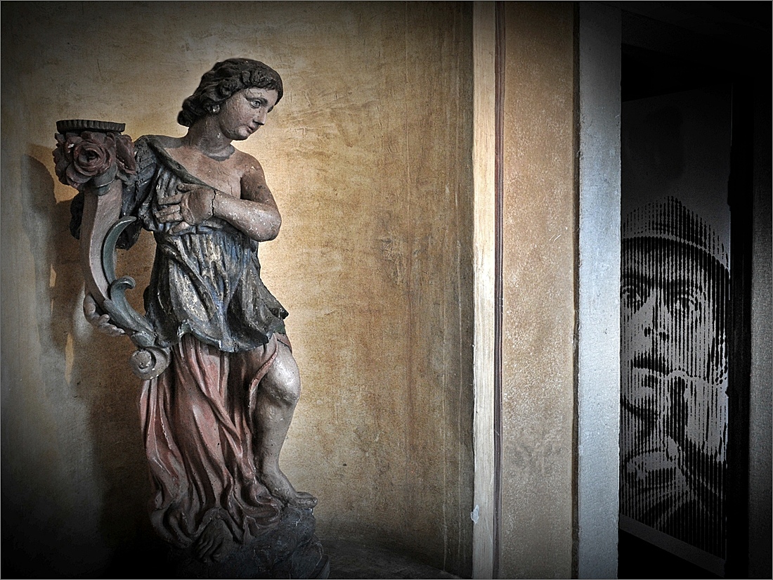 immagine molto interessante fatta di contrasti, colore e b/n, il volto sorridente della statua e quello accigliato dallo sguardo allucinato del soldato che ti fissa e interpella