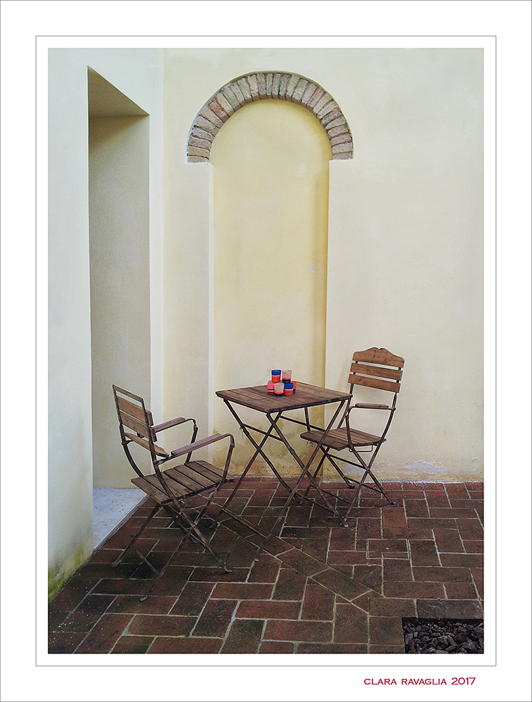 Felicissima che abbiate apprezzato questa piccola ripresa, che ho ripescato mettendo ordine fra gli hard disk, e che non avevo mai pubblicato. una angolino tranquillo, in un giardino interno del centro a Ravenna. Mi avevano colpito le tinte lievi pastello, le linee in fondo eleganti dell'angolo,e quelle candele colorate sul tavolino. Avevo solo il mio smartphone di allora e quello ho usato, e in fondo anche lui no mi ha mai tradito...