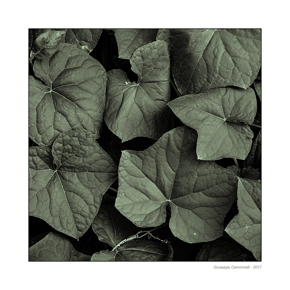 Desaturate, ma non troppo, dalla resa quasi carnosa, elegantissime nel loro abbraccio reciproco, entro il quadrato. Foglie di una edera che si fa simbolo di resistenza, ostinazione, perseveranza.