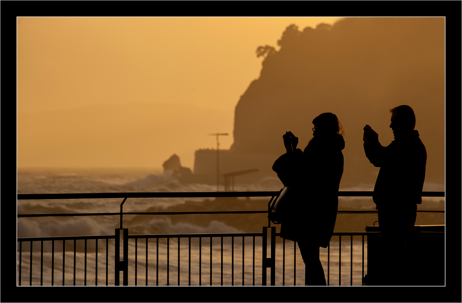 Due soggetti in silhouette davanti ad una luce meravigliosa mentre cercano di fermare quelle onde con i loro smartphone. Onde che, a mio parere, sono tra le cose migliori di questa immagine. Complimenti,