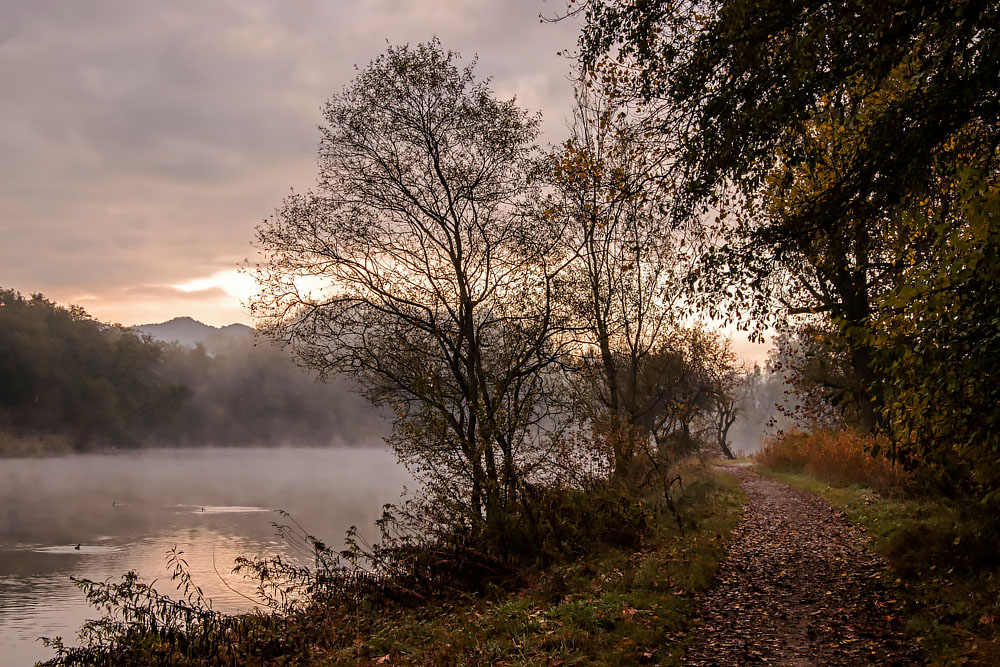 Una immagine come un racconto, una fiaba sonora, un audiobook, e allora sembra di sentire lo scricchiolio dei passi sulle foglie secche che fanno il paio con la terra e la ghiaia del sentiero, un silenzio assoluto rotto ogni tanto dallo starnazzare delle poche anatre e poi il respiro, lo si percepisce più dal vapore che come quello che aleggia sul fiume ci dice della stagione, anche della nostra che dopo il lungo camminare ci fa ansimare leggermente come in un rapporto con la natura, qui vi sei immersa e allora, come sulla riva di un mare, ascolti più te stessa di ciò che ti circonda che sembra avere rispetto nel non voler disturbare quel dialogo.