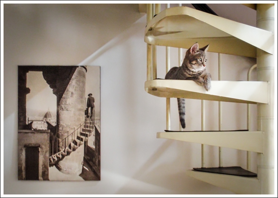 "Ale, ho sempre avuto un debole per questa foto, il potente richiamo delle scale è il catalizzatore insieme alle due anime della foto; quella un po' surreale e metafisica di una Firenze per "pochi" con quell'inganno visivo di una scala verso il nulla e il gatto, animale secondo me già metafisico di suo, impenetrabile e poco malleabile, con quella sensazione di sue visioni esclusive e quel misto di curiosità ed attenzione o chissà cosa altro, imperscrutabile appunto.