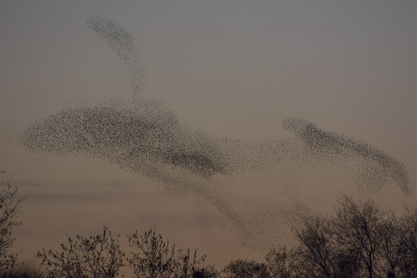 Belle le figure create dal volo degli storni. Sembra siano i rami sotto che si smaterializzano nel cielo.
