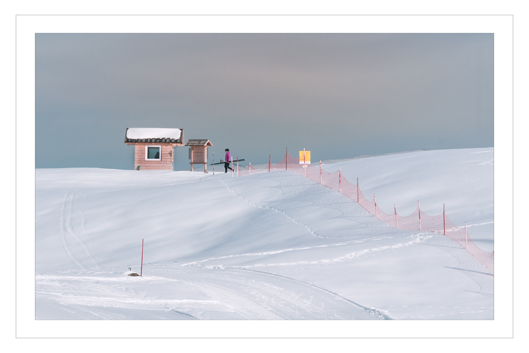 Luce ancora intensa, eppure hai trovato una esposizione sul manto nevoso non troppo esplosiva: lasci distinguere allora qualche percoso tracciato da poche orme fuori pista, qualche binario sinuoso nel manto. Tutto è soffice e come vagamente spolverato di rosa ( la rete che delimita la pista, il cuore delle nuvole...) ma con garbo, senza barare troppo, con grazia direi. La combinazione fortunata di una diagonale colorata nel bianco a destra, data data dalla barriera in ascesa , e il soggetto opposto del gabbiotto di risalita, si controbilanciano benissimo ed interrompono la omogeneità del bianco .Piccola , semplice, ma hai saputo porcela con abilità.