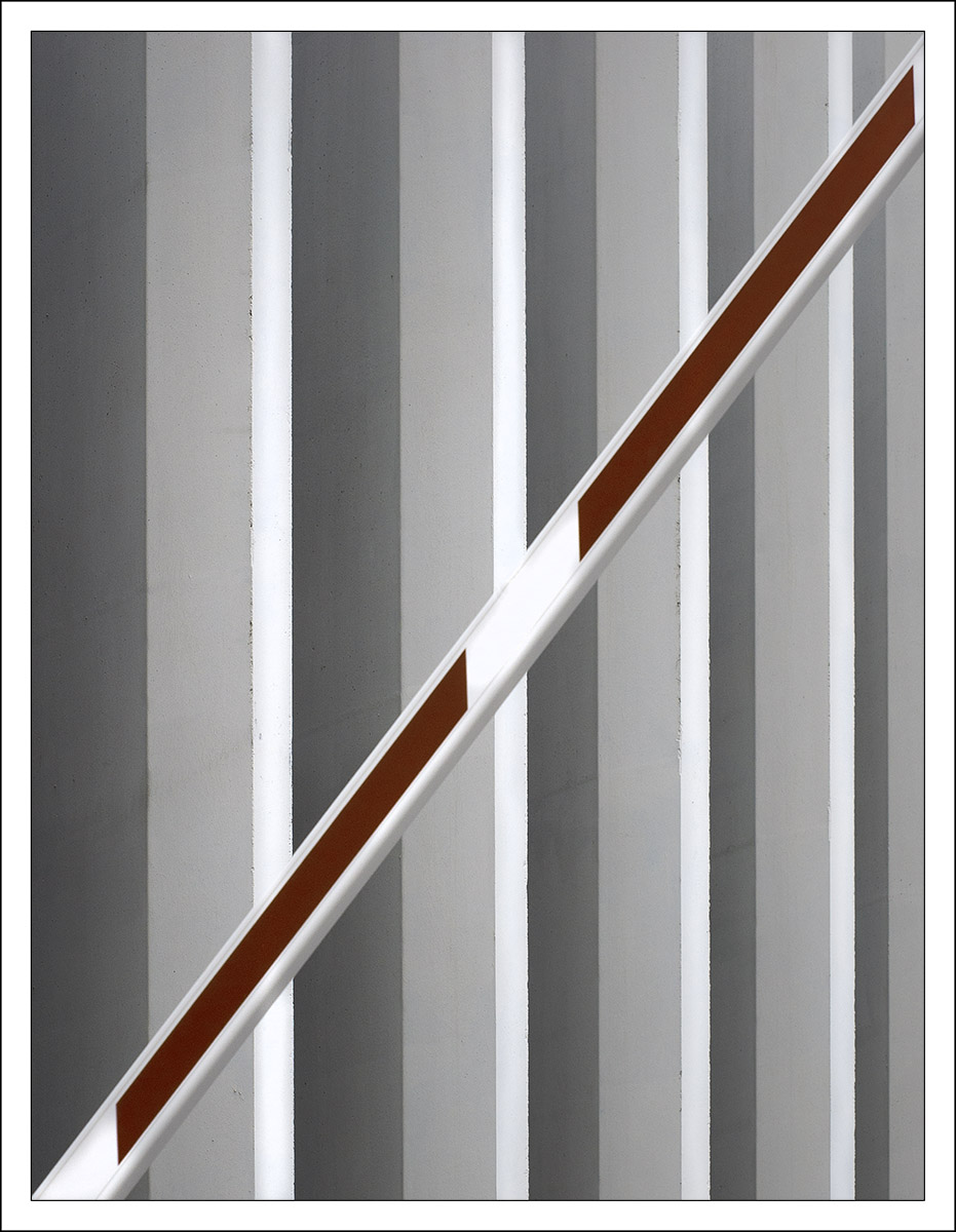 Un minimal rigoroso ed essenziale. Concordo su una maggiore luminosità del rosso. Personalmente, in casi come questo, non opto per una giustificazione delle diagonali come quella te te scelta, ma cerco di far coincidere gli angoli del fotogramma con la zona mediana della sbarra diagonale in quanto, a mio avviso, restituisce meglio una certa tridimensionalità. E' una convinzione "visiva" che mi sono creata "provando e riprovando" e che certamente non troverà tutti d'accordo ma che a me piace. Ciao  |