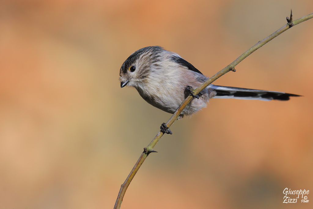 Il codibugnolo si staglia nitido e preciso assieme al rametto sul quale è posato, da uno sfondo colorato e caldo che coinvolge.
