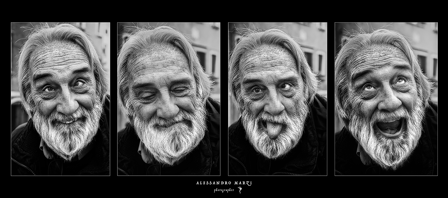 Il tuo soggetto è davvero interessantissimo, un' espressività ed una solarità enormi e coinvolgenti. Non so ,forse la seconda sembra un poco distaccarsi dalle espressioni ironiche e divertenti delle altre tre,ma sai che forse è quella che preferisco? Sembra un sorriso dolce e divertito del tipo"ma guarda che sto combinando" ... ritratti genuini, spiritosi e scanditi da un ottimo bn.. insomma una bella prova! Bravo Alessandro  _________________