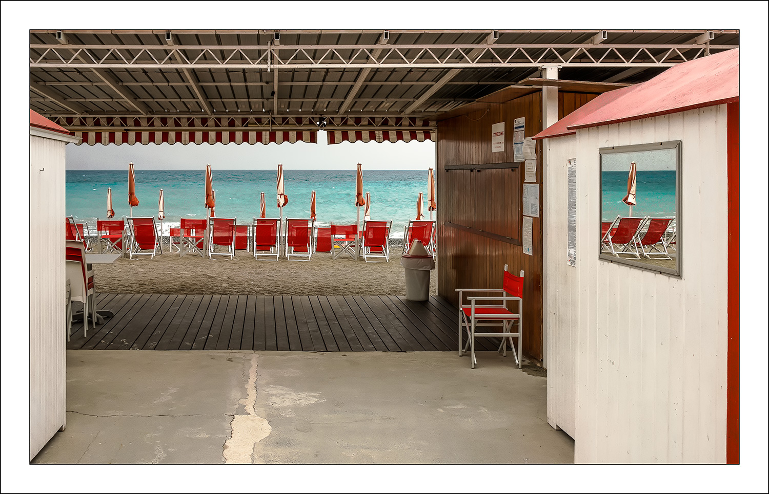 Tutto è pronto per la nuova stagione,anche se gli ombrelloni sono ancora chiusi.Bellissimo il colore del mare e splendido il rosso in tutte le sue apparizioni.Composizione ottima e l'immagine specchiata è la ciliegina sulla torta. Complimenti! Ciao,Sergio.