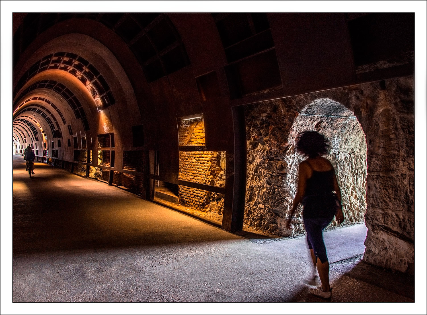 Che bella la luce di questa tua proposta Bruno! Un tunnel con sfumature d'oro e di bronzo che tra pietre e archi accompagna lo sguardo sino alle luminose fughe, appunto. Dinamicità data dalla ragazza in movimento(peccato il piede molto stretto sotto,ma comprensibile visto il pdr e la scelta di inserirla nell'arco) e dall'arrivo in senso contrario dei ciclisti.Questo luogo mi affascina. Bravo,mi piace
