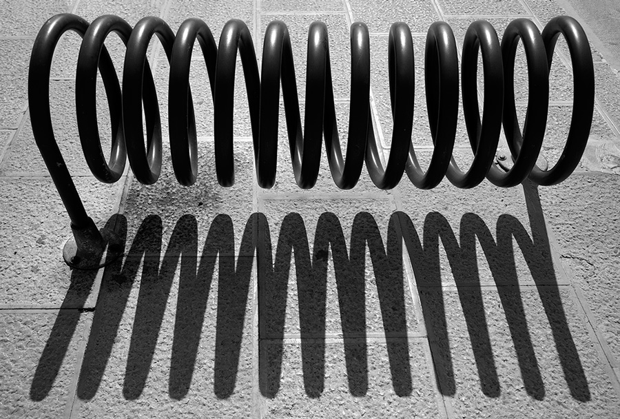 La nota insolita, il potenziale filamento di lampadina ad incandescenza, che però si disegna sul selciato con un' ombra assouta, al posto della luce, di cui invece si serve ,come di una pennello. Circolarità tridimensionali che diventano a terra uno zig zaa greca di rette tracciate. La parte nascosta , non subito apparente, ed un po' contraddittoria della realtà , fa sempre capolino nel tuo osservare.
