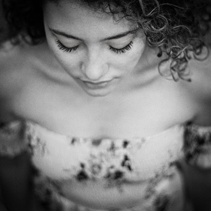 Davvero emeozionante. E magico i dialogo silenzioso fra i riccioli di fiorami nell'abito, e i boccoli che si attorcigliano fra i capelli. Punto di scatto decisivo e bianco e nero raffinatissimo.
