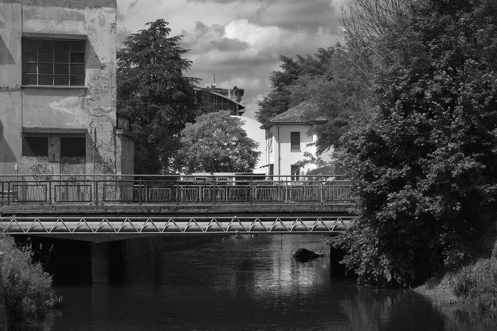 Il fascino della semplicità lucente di un piccolo angolo di abitato, dove improvvisa si fa strada come protagonista, oltre il ponte e la macchia di oscurità della acqua che scorre, una zona di luce piena, fra il verde: una parete candida che rifeltte il sole , o un frmmento di struttura sportiva che si azxa oltre le case. Il tutto è ripreso con verità valorizzta , grazie alla corretta gestione di luce e compo.