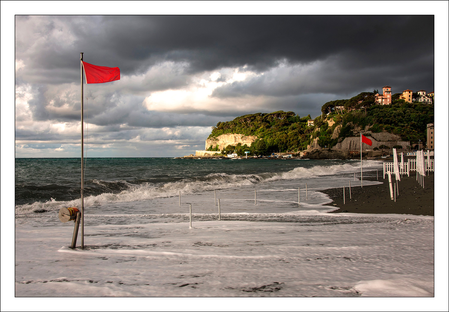 Luce di burrasca e rosse bandiere che indicano pericolo. Il mare spuma e si respira salsedine al solo osservare. Il mare che più mi piace.