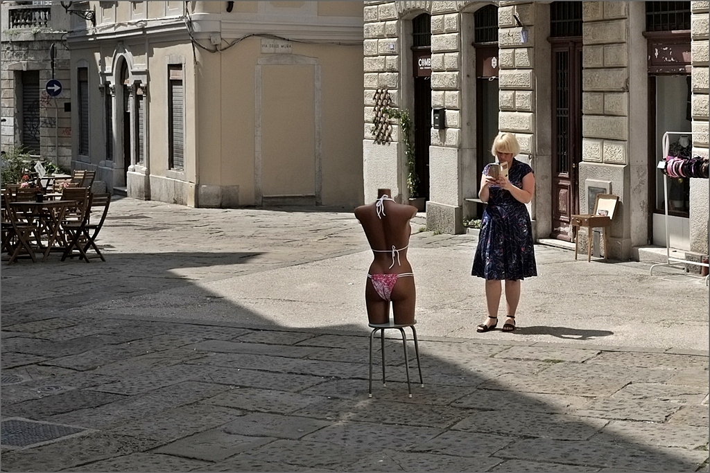 Davvero ben colta Sergio. Simpatica scena,con una fotografa un po furtiva ed una modella che fa bella mostra di se.A me non dispiace l'inquadratura ampia,rende più insolita la scena,con il manichino che sembra finito la in mezzo per chissà quale motivo.Mi piace anche la suddivisione in diagonale tra luce e ombre,insomma una proposta piacevolissima come tuo solito  _________________