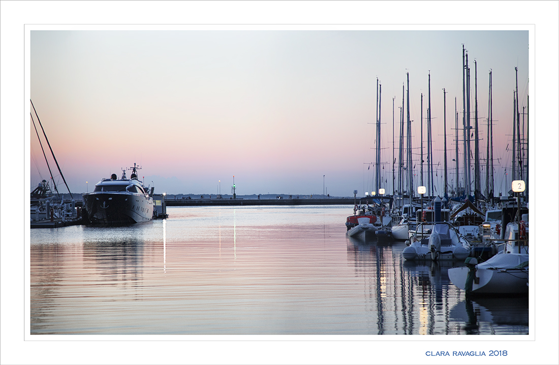 gli ultimi toni della sera, quando il colore lentamente sfuma nella notte. Il mare tranquillo appena smosso da una leggera brezza, gli alberi delle barche allineati formano questi invisibili cancelli. Di grande fascino e delicatezza.