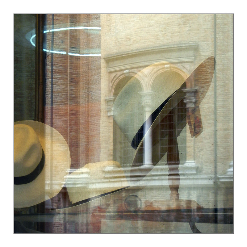 Il riflesso delle colonne richiama il sostegno portacappello. Eleganza sia nei copricapi esposti sia nel riflesso architettonico.