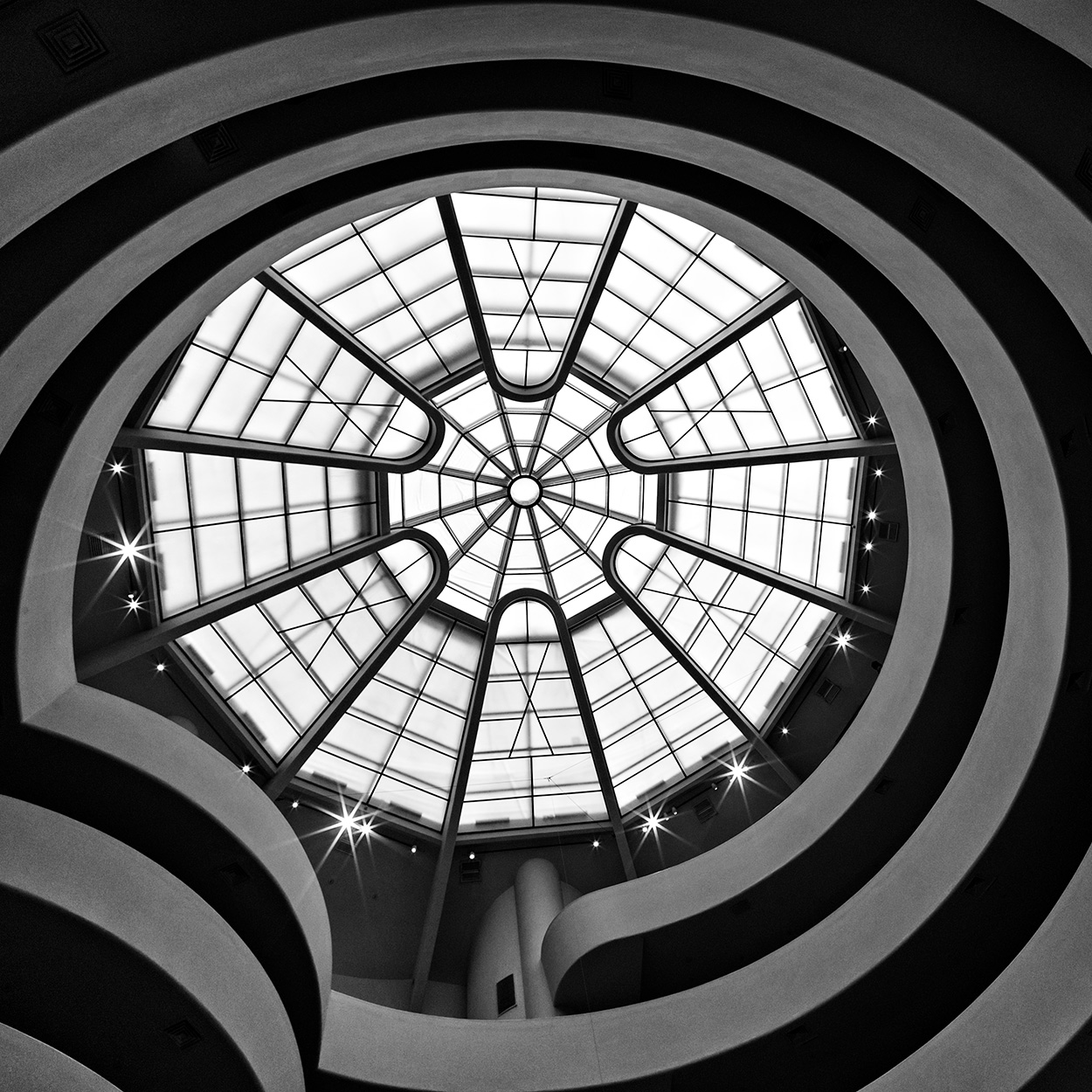 La ripresa simmetrica, per quanto si possa parlare di simmetria all'interno del Guggenheim, è ovviamente possibile ma a condizione, ovvia, che ci si posizioni a terra e la distanza si fa sentire. Bisognerebbe avere un mediotele per riuscire a inquadrare una porzione significativa della volta.