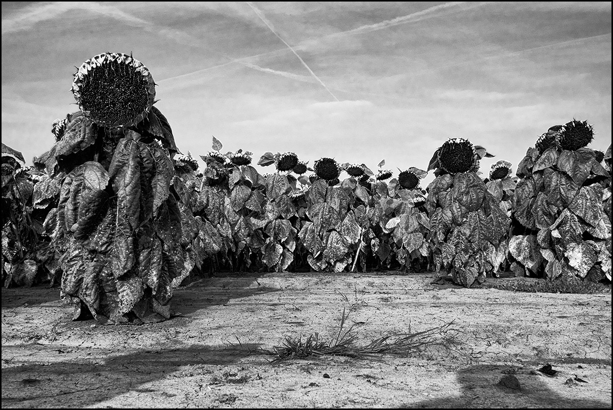 dopo i colori brillanti dei girasoli in fiore oggi ce li presenti sfioriti con il "capo" chino, giustamente in un b/n cupo. Sic transit gloria mundi