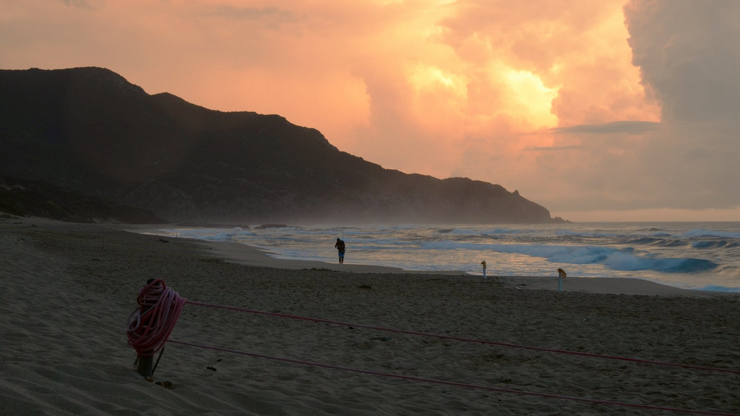 Ottima composizione e bellissimo contrasto cromatico tra la spiaggia in ombra e le nuvole cariche ancora di sole.La piccola figura umana fulcro di questa splendida immagine.Complimenti! Ciao,Sergio. Smile