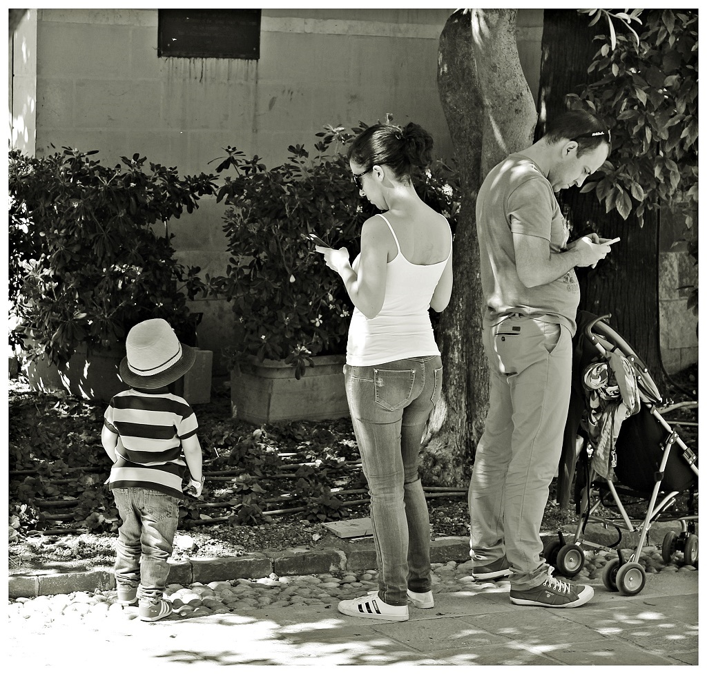 Non riesco a vedere questo raro, unico momento e irripetibile per certi versi che una street debba richiedere. In tutti i casi, situazione ad oggi molto diffusa quella di restare inmobilizzati di fronte al dio smartphone tanto da non capire cosa accada intorno. Magari proprio lo stupore di un bimbo di fronte a qualcosa che... sfugge. Tuttavia, viraggio a mio avviso debole a parte, la scena, compresa il titolo la ritengo una di quelle un po azzardate. Amici ? Parenti? Non credo altrimenti avrebbe perso quella minima percentuale di street. Resta quindi la foto di due anzi tre sconosciuti che vengono identificati con un titolo del genere... non so... sarebbe da chiedere ai genitori Cosa pensano di questo tuo scatto