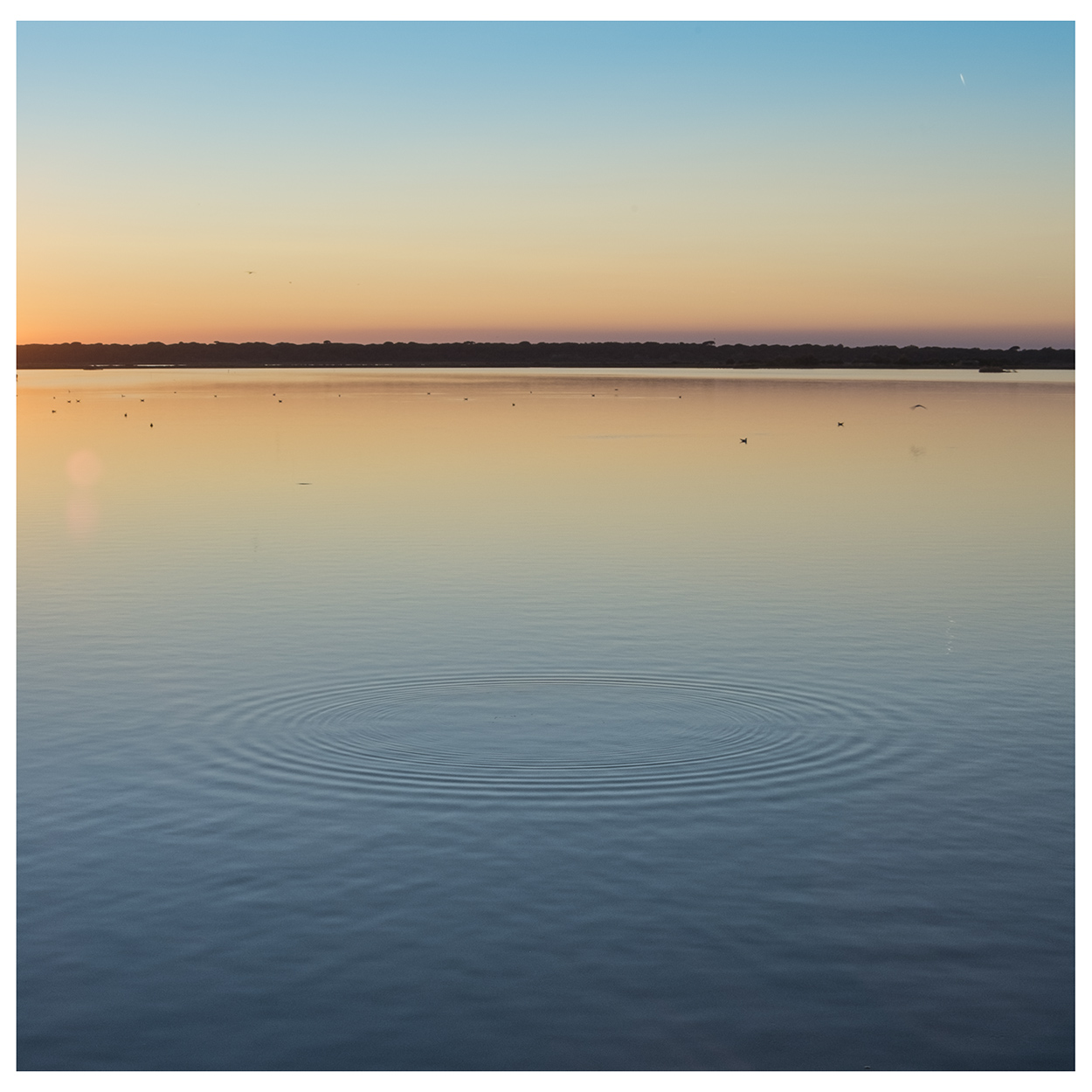 Poetica, accostamento cromatico ben riuscito, dove la parte bassa dell'acqua riprende il cielo. Al centro preciso i cerchi, che fanno riflettere in questa quiete trasmessa.