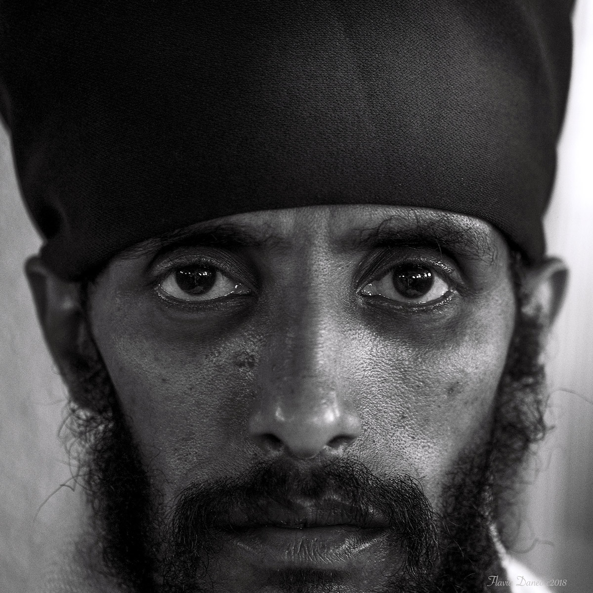 Questo prete della chiesa etiope ortodossa mi aveva molto colpito per il suo volto ascetico e per quegli occhi come divorati da un fuoco interiore tant'è che, guardandolo, mi erano venute alla mente le parole bibliche che poi ho messo in introduzione. Ho quindi optato, già in fase di ripresa, di dare maggior risalto agli occhi e al copricapo che lo individuava come religioso. Con meno copricapo, a mio modo di vedere, sarebbe stato meno identificabile il suo ruolo e avrebbe potuto essere una persona qualsiasi con un accenno di copricapo qualsiasi. Ma forse la suggestione che ho provato io sul luogo non sono riuscita a trasmetterla ad un osservatore esterno...