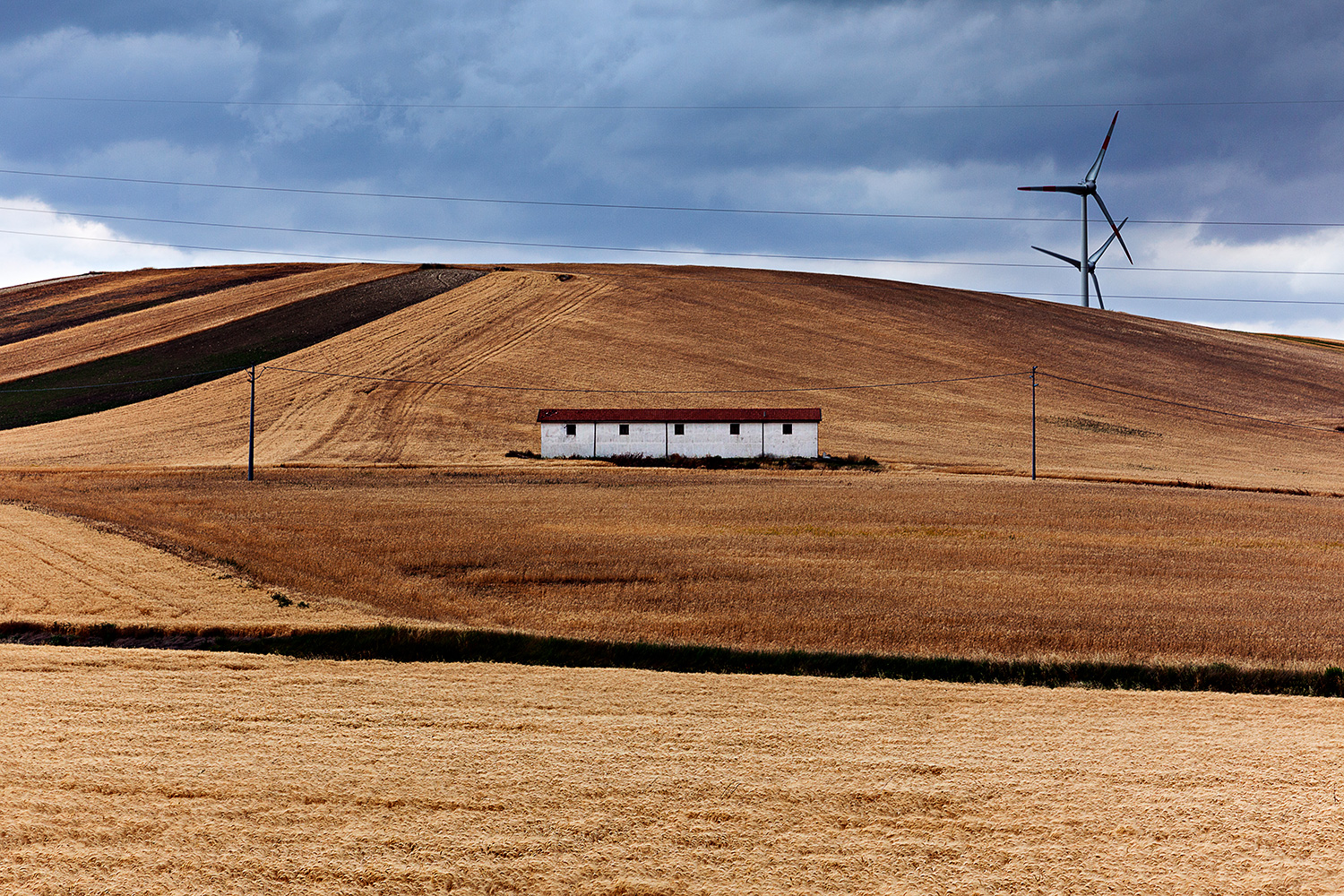 Trovo splendida la parte "calda" dell'immagine, con tutte le sue linee,parallele,a volte opposte,a volte complementari.Giochi geometrici accattivanti,fatti di suadenti sfumature bronzee e terrose.Mi piace il cielo, con il suo essere ordinatamente ricco e freddo in ottimo contrasto. Il casolare al centro,una calamita per lo sguardo, geometrico ed essenziale,perfettamente incastonato nello sfondo. E poi ci sono quelli che spesso sono considerati degli elementi di disturbo,cavi e pale,che tu invece hai abilmente utilizzato per dare un plus allo scatto. Mi piace parecchio,complimenti Massimo  _________________