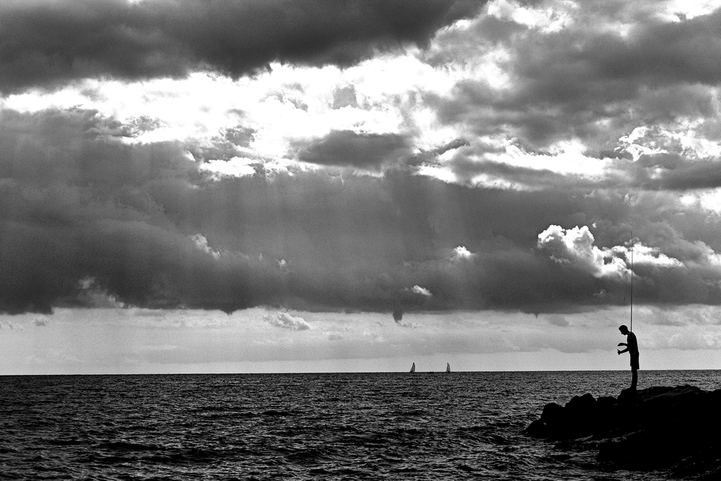 Bel BN drammatico e narrativo. Bella la figura del pescatore in silhouette che regge quel cielo cupo e minaccioso, piccolo e indisparte a sottolineare la nostra mincusola presenza di fronte alla natura.