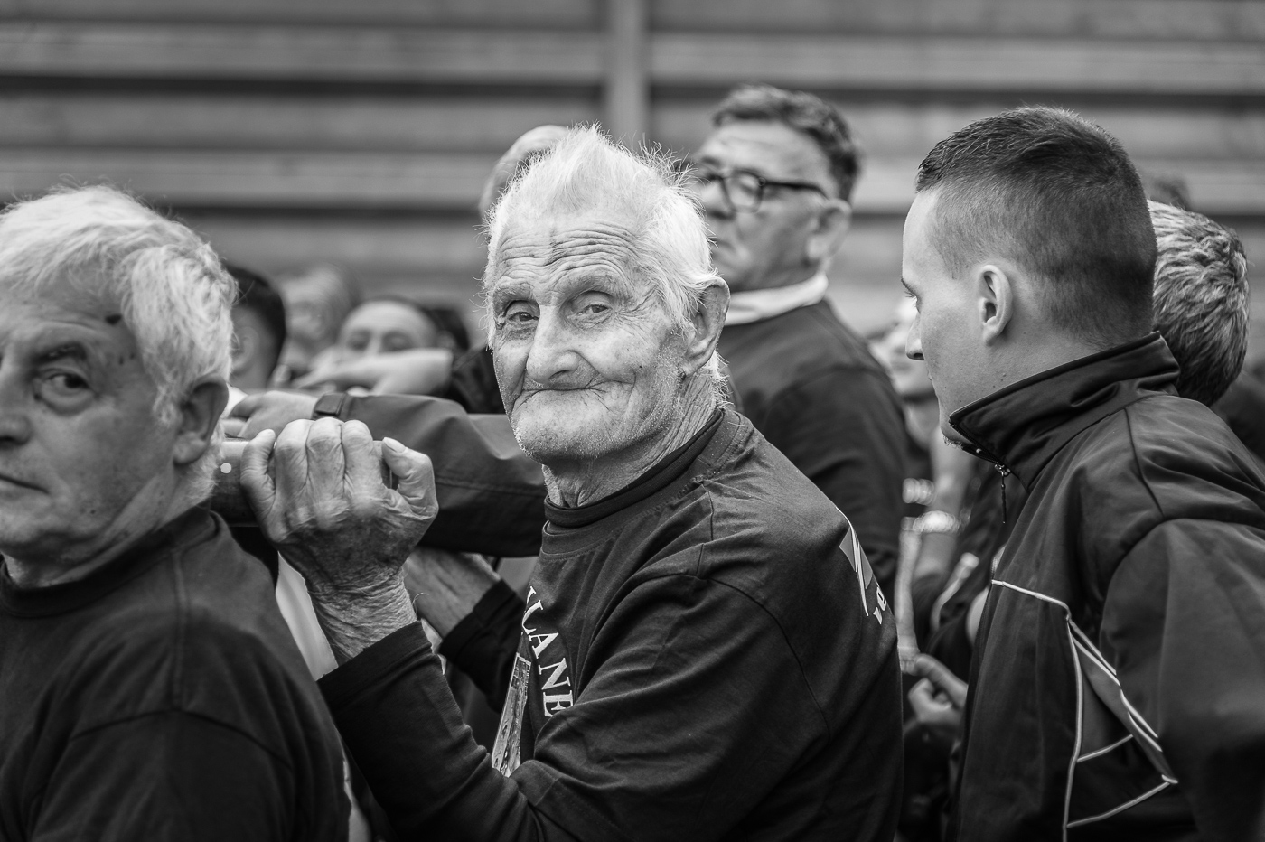 Per me questo è davvero un bel ritratto Salvatore... con questo taglio, purtroppo ci giunge poco della scena,ciò che fanno si può più intuire ,anche grazie al titolo, che realmente vedere e questo ,secondo me,fa perdere un po di valore allo scatto se voleva raccontare qualcosa su questa attività o lo si vuole analizzare in generale. Ma ecco che invece lo sguardo viene letteralmente rapito da questo nonnino dall'aria spavalda e dolce insieme,e allora tutto cambia. Ci si concentra su di lui,sul suo guardare dritto e sicuro in camera,in un attimo di complicità tra voi, sulla sua forza e la sua esperienza che il suo viso ricoperto di rughe racconta, su questa pettinatura un poco sbarazzina che ci parla di un carattere sicuramente intraprendente ,di uno spirito vivo . E magari concentrandoti su di lui non ci sarebbe stata male neanche una ripresa verticale.. non so, questi ovviamente son solo i miei pensieri.. però a me piace
