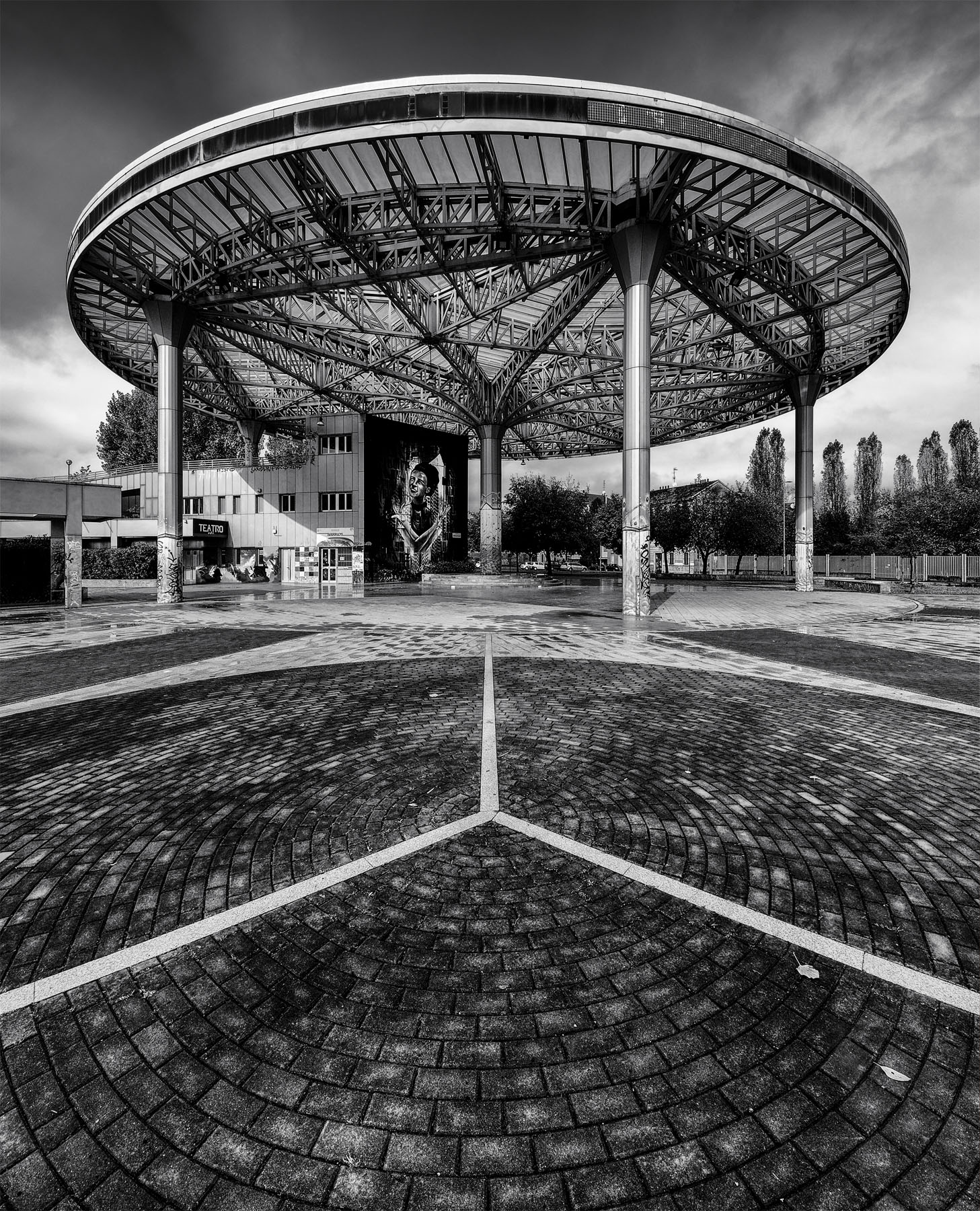 Ottimo rigore compositivo e BN...il richiamo dei disegni circolari a terra con la struttura è vincente